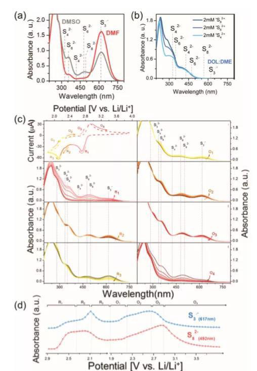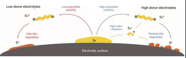 在尋找多硫化物高度可溶的溶劑方面,具有Gutmann給體數(shù)的電解質(zhì)具有很大的潛力。事實(shí)上,二甲基乙酰胺(DMA)和二甲基亞砜(DMSO)被證明在實(shí)際的鋰硫電池中具有基于多硫化物高溶解度的貧電解質(zhì)條件下的大比容。另一種高供體電解質(zhì),二甲基甲酰胺(DMF),也被證明能夠在鋰電池中放電,但這種電解質(zhì)尚未在貧電解質(zhì)條件下進(jìn)行評(píng)估。 因此,與傳統(tǒng)的1,3-二氧環(huán)烷/1,2-二甲氧基乙烷(DOL/DME)電解液相比,這些電解液可以提供更有效的途徑來獲得更高的能量密度。事實(shí)上,DOL/DME系統(tǒng)在室溫下只能溶解高達(dá)1m的Li2S6,一種在放電過程中產(chǎn)生的多硫化物。多硫化物在高給體電解質(zhì)中的高溶解度與多硫化物的歧化和解離途徑有關(guān)。這些在低施主電解質(zhì)中不可用的途徑涉及在充放電過程中生成三硫自由基陰離子(S3-)。這種自由基陰離子引發(fā)多種反應(yīng)途徑,即使對(duì)于含硫量較高的電極,也能充分利用硫。此外,高施主電解質(zhì)允許形成大顆粒形式的Li2S沉積物,而不是薄膜,這允許電極通過絕緣Li2S繞過鈍化,并保留其導(dǎo)電表面,以促進(jìn)長期循環(huán)過程中的穩(wěn)定氧化還原反應(yīng)。