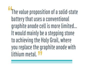 “固態(tài)電池的價值主張采用傳統(tǒng)石墨陽極電池是很局限性的。傳統(tǒng)石墨陽極的固態(tài)電池可以成為理想型電池的敲門磚,可以用金屬鋰代替石墨陽極。