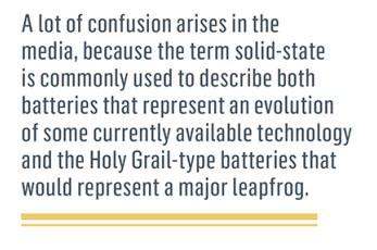 在媒體上產(chǎn)生很多混亂,因為固態(tài)的說法通常用于形容某種當(dāng)前的可用技術(shù)發(fā)展的電池以及在性能上有飛躍提升到理想型電池。