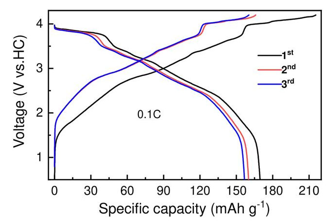 圖4. O3-NNFM正極和硬碳負(fù)極全電池在0.5-4.2 V電壓范圍內(nèi)的前三周充放電曲線