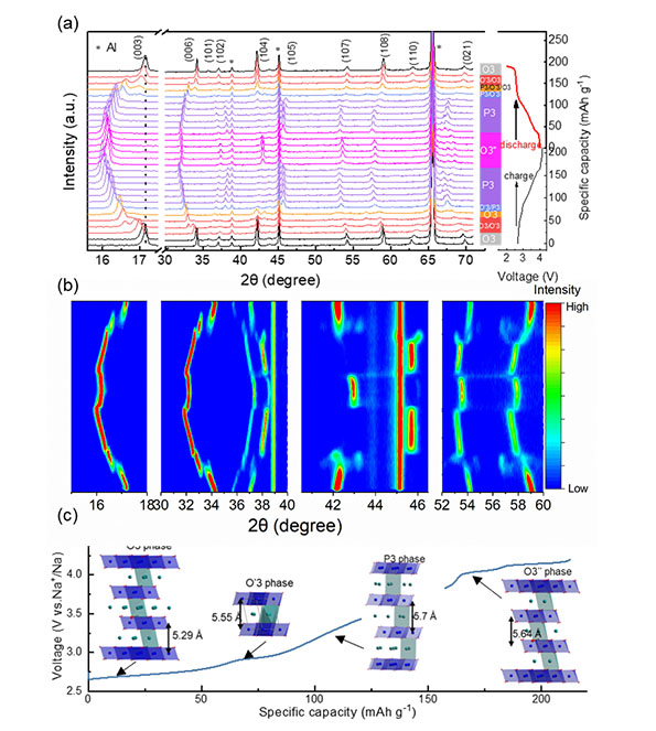 圖3. O3-NNFM材料(a,b)首圈充放電過(guò)程中的原位XRD圖譜和2D contour圖,(c)充電過(guò)程中的結(jié)構(gòu)演化示意圖