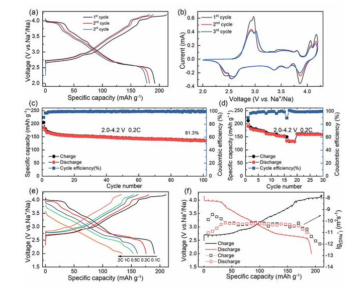 圖2. O3-NNFM電極在2.0-4.2 V電壓范圍內(nèi)的(a)前三周充放電曲線,(b)CV曲線,(c)循環(huán)性能,(d)和(e)倍率性能