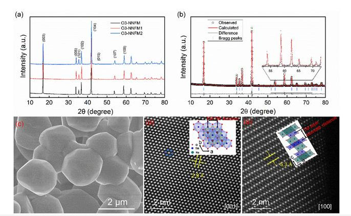 圖1.(a)系列O3-Na[NixFeyMn1-x-y]O2 (x=0.6、0.7和0.8分別對(duì)應(yīng)O3-NNFM、O3-NNFM1和O3-NNFM2)樣品的XRD圖譜,(b-e)O3-Na[Ni0.60Fe0.25Mn0.15]O2的XRD圖譜精修、SEM和STEM表征