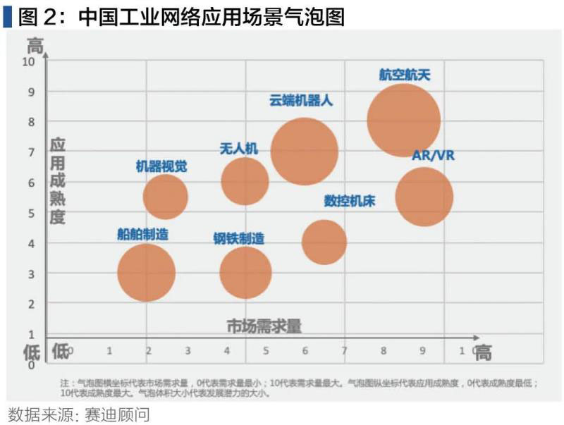 隨著我國(guó)5G技術(shù)的不斷更新,5G在制造業(yè)各個(gè)領(lǐng)域的需求量不斷上升。目前我國(guó)5G在制造業(yè)中多應(yīng)用于大飛機(jī)制造、無(wú)人機(jī)、云端機(jī)器人、AR/VR、鋼鐵制造中。航空航天領(lǐng)域由于具有較高技術(shù)含量和較高附加值,其資本投入高、信息密集度高、帶動(dòng)能力較強(qiáng),和5G的結(jié)合在市場(chǎng)需求量及應(yīng)用成熟度均排在行業(yè)首位。云端機(jī)器人行業(yè),隨著人工智能、云計(jì)算等技術(shù)與機(jī)器人的不斷融合,5G的應(yīng)用成熟度僅次于航空航天。未來(lái)隨著企業(yè)智能化程度的提高、生產(chǎn)設(shè)備信息化率和聯(lián)網(wǎng)率的提升, 5G在鋼鐵制造、船舶制造領(lǐng)域的應(yīng)用也會(huì)逐步打開(kāi)。