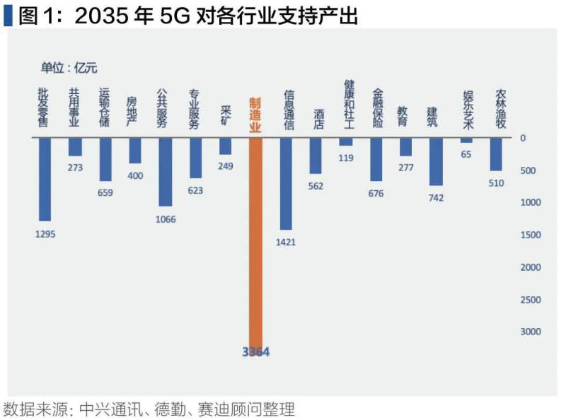5G將讓ICT與傳統(tǒng)行業(yè)真正實(shí)現(xiàn)深度融合,將網(wǎng)絡(luò)變得更加開(kāi)放,為垂直行業(yè)應(yīng)用創(chuàng)新提供綜合能力。一方面,傳統(tǒng)行業(yè)未來(lái)軟件化、智能化將是大勢(shì)所趨。另一方面,傳統(tǒng)行業(yè)具備場(chǎng)景決定能力和完善的知識(shí)價(jià)值體系,5G將促進(jìn)ICT技術(shù)與其需求深度匹配。據(jù)統(tǒng)計(jì),預(yù)計(jì)在2035年,5G對(duì)各個(gè)行業(yè)的支出產(chǎn)出中,制造業(yè)領(lǐng)域的支持產(chǎn)出遙遙領(lǐng)先,超過(guò)3000億元。