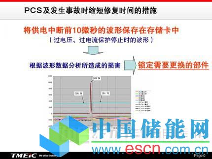 PCS配備了過(guò)電壓、過(guò)電流保護(hù)裝置,會(huì)斷開直流電路來(lái)防止雷擊導(dǎo)致事故擴(kuò)大,但重要的是,發(fā)生故障后如何盡快修復(fù),從而使發(fā)電損失降至最低。TMEIC通過(guò)將保護(hù)裝置啟動(dòng)10μs之前的電壓及電流波形保存在存儲(chǔ)卡內(nèi),來(lái)掌握入侵的浪涌能量,并在短時(shí)間內(nèi)鎖定發(fā)生故障的部件,由此縮短了修復(fù)時(shí)間(圖)。