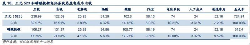 在考慮模組、PACK 及電池系統(tǒng)的情況下,三元 523 和磷酸鐵鋰電池系統(tǒng)的總度電成本分別為 724.91 和 612.40 元/kWh。