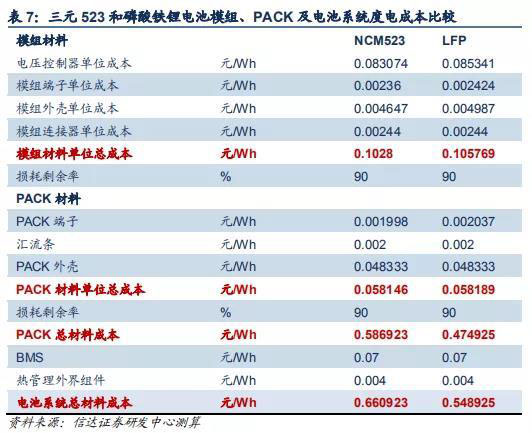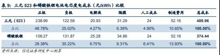 僅考慮電芯的情況下,三元 523 和磷酸鐵鋰電芯的度電成本分別為 486.96 和 374.44 元/kWh。