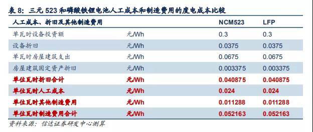 動力電池生產(chǎn)成本包括人工成本和制造費用,制造費用其中有包括設(shè)備和房屋建筑折舊及其他制造費用。我們假設(shè) 1GWh 產(chǎn) 能設(shè)備投資價值 3 億元,人工 400 人,每年工作 300 天,每天工作 8 小時,人工小時數(shù)為 960000 小時/年,工時費 25 元/時, 對應(yīng) 2400 萬元/年,得出人工成本 24 元/KWh;設(shè)備折舊年限為 8 年,年折舊率為 12.5%,得出設(shè)備折舊 37.5 元/KWh;單 GW 產(chǎn)線占地面積 4500 平方米,房屋建筑固定資產(chǎn)支出 15000 元/平方米,折舊年限為 20 年,年折舊率 5%,得出房屋建筑 固定資產(chǎn)折舊為 3.38 元/KWh。整體上,我們測算得出三元 523 和磷酸鐵鋰電池人工的度電成本分別均為 24 元/KWh,折舊 對應(yīng)的度電成本分別均為 40.88 元/KWh,其他制造費用對應(yīng)的度電成本分別均為 11.29 元/KWh。