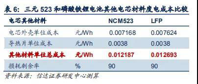 除以上外,電芯其他成本主要還包括外殼和導(dǎo)熱片,整體占比較低。三元 523 和磷酸鐵鋰電池其他電芯材料的度電成本分別 為 12.18 和 12.69 元/ kWh。
