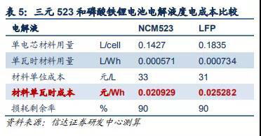 電芯材料中電解液占比較隔膜略低。三元 523 電解液的度電成本為 20.93 元/ kWh,磷酸鐵鋰為 25.28 元/ kWh。