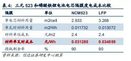 三元和磷酸鐵鋰電池隔膜的度電成本較為接近,三元為 31.29 元/ kWh,磷酸鐵鋰的為 34.86 元/kWh,區(qū)別同樣在于磷酸鐵鋰 電池能量密度較低導(dǎo)致材料用量多于三元。