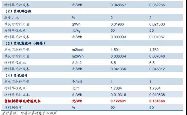 負極材料包括負極活性材料、負極粘合劑、負極集流體(銅箔)和負極組件負極端子。據(jù)我們測算,目前三元 523 負極活性 材料、粘合劑、銅箔、負極端子度電成本分別為 48.66、0.99、41.37、19.32 元/kWh,磷酸鐵鋰電池分別為 52.27、1.07、 45.81、19.54 元/kWh,負極材料中活性材料、銅箔和負極端子成本占比較高,粘合劑占比較低。考慮到材料損耗,我們測算 得出三元 523 負極材料度電總成本為 122.59 元/ kWh,磷酸鐵鋰負極材料度電總成本為 131.87 元/ kWh。由于能量密度的不 同以及其他材料接近的原因,磷酸鐵鋰電池的負極材料成本高于三元電池。