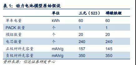 我們假設(shè)單車帶電量 60kWh,包括 1 個電池包,20 個模組和 240 個電芯,以上假設(shè)主要用于測算模組和 PACK 組件成本。 我們選取三元動力鋰電池 523 型和磷酸鐵鋰電池作為研究對象進行分析比較。參考當升科技公告數(shù)據(jù),我們假設(shè)三元(523) 正極材料實際克容量為 157mAh/g。參考國軒高科和豐元股份公告數(shù)據(jù),目前國內(nèi)磷酸鐵鋰正極材料實際克容量基本已經(jīng)達到 150mAh/g,我們?nèi)?145mAh/g 的平均水平作為磷酸鐵鋰正極材料實際克容量假設(shè)。參考杉杉股份公告數(shù)據(jù),我們假設(shè)負極活 性材料(人造石墨)實際克容量為 350 mAh/g。