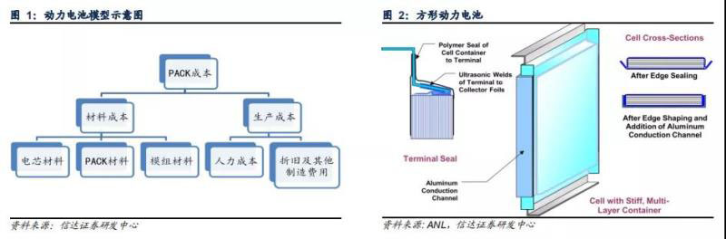 鋰電池根據(jù)應(yīng)用領(lǐng)域的不同分為動力電池、儲能電池和消費電子電池,不同類型鋰電池的成本構(gòu)成自然不同,本篇報告主要 講述應(yīng)用最廣泛的動力電池成本結(jié)構(gòu)。動力電池在不同的正負極材料下其成本有一定差別,整體來看材料成本占比較大,人 工成本、折舊及其他制造費用占比較小,而材料成本則主要以正負極材料、隔膜、電解液和組件為主。 我們在動力電池成本模型里將 PACK 成本拆分成材料成本和生產(chǎn)成本,其中材料成本又包括電芯材料、模組材料及 PACK 材 料,生產(chǎn)成本包括人力成本、折舊及其他制造費用。我們參考 ANL 的成本測算模型,選取方形電池進行成本拆分。