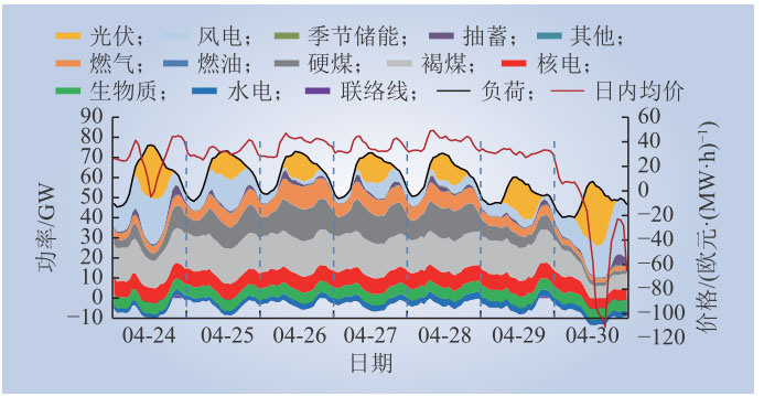 從實際運行來看,新能源按照0電價參與電力市場競價(實際結(jié)算電價還包括政府補貼),以保障優(yōu)先上網(wǎng)。當新能源出力高時,電力市場的出清電價下降,甚至出現(xiàn)負電價,受電價影響,火電、燃油燃氣發(fā)電等盡可能降低出力,國外電力市場同樣從德國買入電力;當新能源出力低時,電力市場出清價大幅上漲,刺激各類靈活電源包括國外電源提高發(fā)出電力。