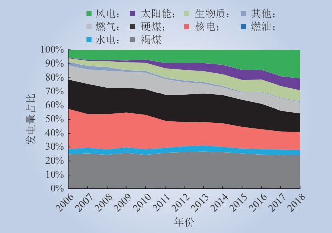 從各類電源年發(fā)電量變化看,褐煤、水電、燃油機組發(fā)電量未有明顯變化;核電受裝機容量減小影響,發(fā)電量減?。伙L電、太陽能發(fā)電、生物質(zhì)發(fā)電受裝機容量增大影響,發(fā)電量迅速增長;硬煤發(fā)電量逐年減小,但幅度下降不大;燃氣發(fā)電雖然裝機容量增長較快,但發(fā)電量有所降低。各類電源年發(fā)電量占比的變化情況如圖2所示,可以看出,風電、太陽能發(fā)電、生物質(zhì)發(fā)電發(fā)電量占比不斷增加,替代了部分核電、硬煤發(fā)電和燃氣發(fā)電電量。