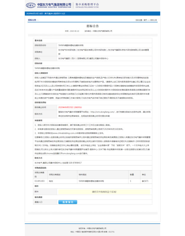 6月10日,東方電氣集團(tuán)下屬東方電氣中央研究院發(fā)布招標(biāo),擬采購5MWh磷酸鐵鋰電池模塊。