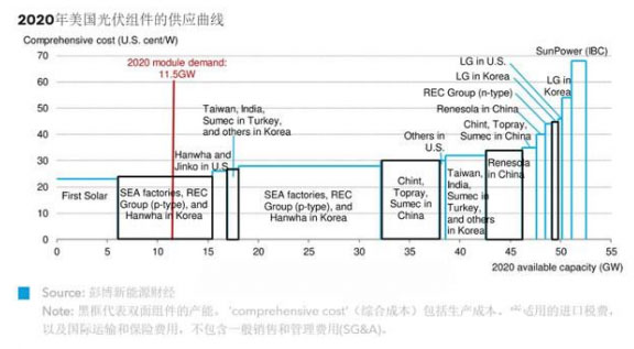美國國際貿(mào)易法院(CIT)裁定,進口雙面組件將繼續(xù)豁免201關稅,免征關稅的決定有望持續(xù)至2020年年底?;谶@一新假設,彭博新能源財經(jīng)更新了美國光伏組件的供應曲線,以預估今年年內(nèi)美國市場的組件價格。