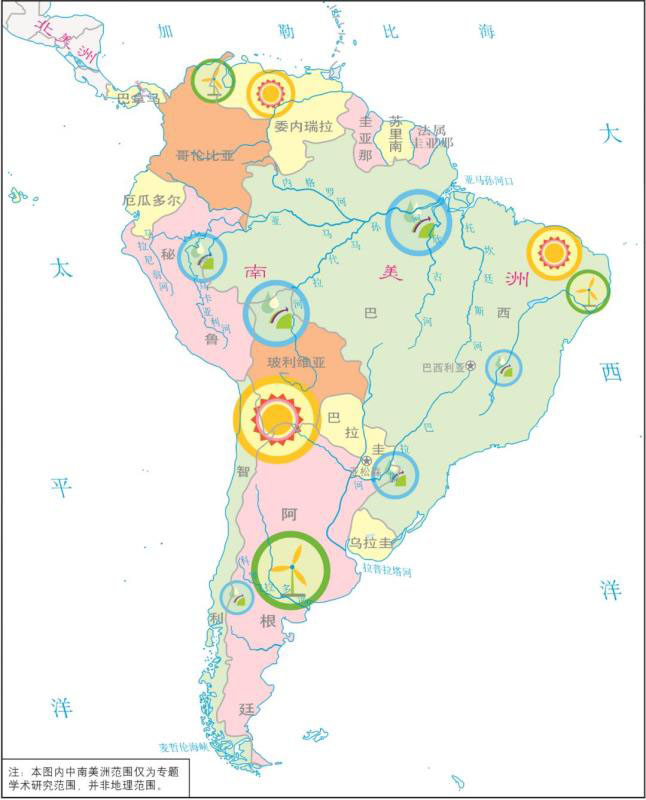 以巴西為中心的南美東部是中南美洲主要負荷中心;南美南部通過大規(guī)模開發(fā)水電、風(fēng)電和太陽能成為重要的電力送出基地;