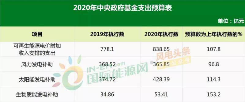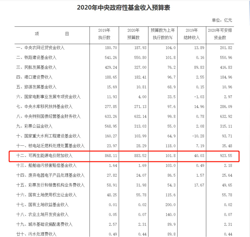 根據(jù)財(cái)政部公布的《2020年中央財(cái)政預(yù)算》,2020年可再生能源電價(jià)附加收入預(yù)算數(shù)為883.52億元,比2019年執(zhí)行數(shù)增加15.41億元,增長(zhǎng)1.8%。主要根據(jù)社會(huì)用電量預(yù)計(jì)增長(zhǎng)情況測(cè)算。