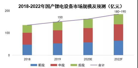 目前,國(guó)產(chǎn)用鋰電設(shè)備的國(guó)產(chǎn)化率已達(dá)到90%-92%。受新增產(chǎn)能帶動(dòng),到2022年,屬于國(guó)產(chǎn)鋰電設(shè)備的市場(chǎng)份額將達(dá)到180-190億元。