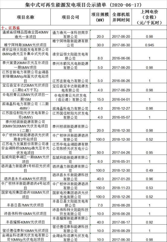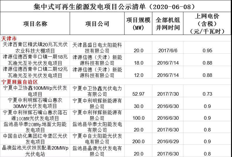 日前,國(guó)家電網(wǎng)公司公示了最新的國(guó)網(wǎng)經(jīng)營(yíng)區(qū)域內(nèi)可再生能源補(bǔ)貼清單復(fù)核通過項(xiàng)目名單,截止目前,已公布江蘇、河南、陜西、新疆、天津、寧夏六個(gè)省市光伏、風(fēng)電項(xiàng)目名單,其中包含82個(gè)光伏項(xiàng)目,總裝機(jī)容量2705.05MW。(注:表格中6MW以上分布式按集中式計(jì)算容量)