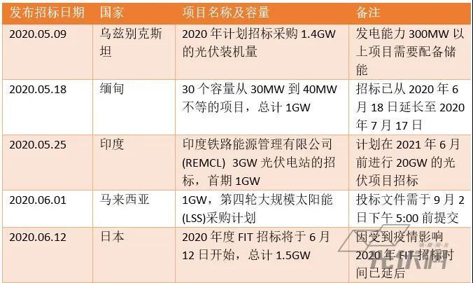 目前,亞太地區(qū)因疫情初期的防疫措施導(dǎo)致的項目延期已經(jīng)開始有所緩解,緬甸、馬來西亞、烏茲別克斯坦、印度等亞洲國家分別發(fā)布了容量相當(dāng)大的光伏招標(biāo),以此來刺激國內(nèi)市場的復(fù)蘇。詳情如下: