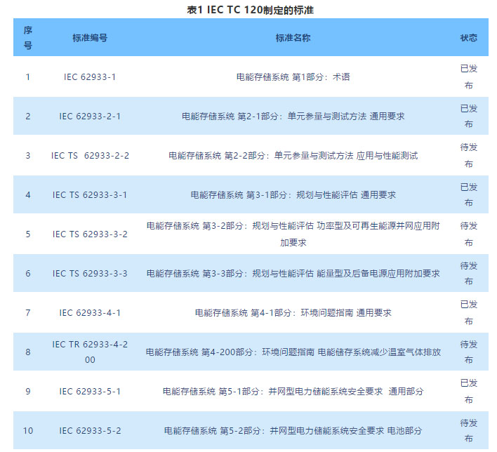 除IEC TC 120外,其他TC也制定了儲能相關(guān)標準,比如IEC 62909-1雙向并網(wǎng)換流器 第1部分:一般要求、IEC 62619工業(yè)用二次鋰電池和電池組、IEC 61427-1 可再生能源儲能用蓄電池和蓄電池組 第1部分:光伏離網(wǎng)應(yīng)用、IEC 61427-2 可再生能源儲能用蓄電池和蓄電池組 第2部分:并網(wǎng)應(yīng)用等。