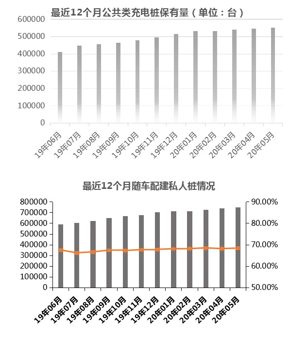 截至2020年5月,我國公共充電樁保有量為550588臺,較上月保有量僅增加3824臺,環(huán)比增長0.70%。