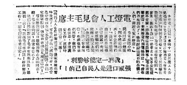 10月20日,工作隊(duì)員在楊家?guī)X終于見(jiàn)到了毛主席,毛主席聽(tīng)完大家的匯報(bào),笑著對(duì)大家說(shuō):“謝謝,謝謝!你們一路很辛苦,安不安電燈不要緊,煤油燈還是能辦事”,“請(qǐng)你們將來(lái)回去,替我感謝張家口的全體同志們,謝謝大家的好意”。