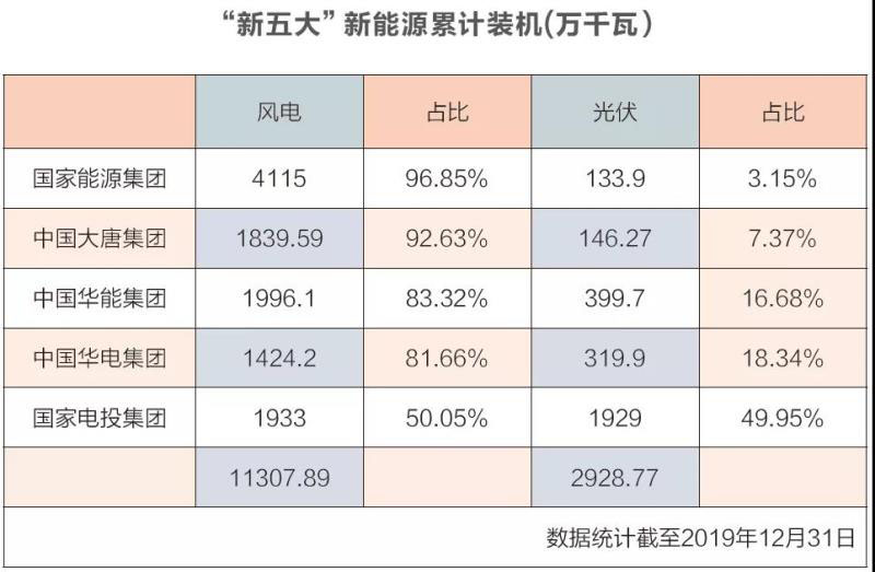毫無疑問,“新五大”同樣是發(fā)展新能源的主力軍。《能源》雜志統(tǒng)計(jì)數(shù)據(jù)顯示,截至2019年底,“新五大”發(fā)電集團(tuán)的風(fēng)電累計(jì)裝機(jī)量為11307.89萬千瓦,超過了全國風(fēng)電裝機(jī)的一半,而光伏裝機(jī)量為2928.77萬千瓦,在光伏裝機(jī)總量中占比較小。