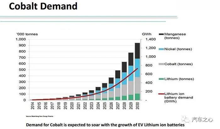 但是,隨著特斯拉、大眾等車企在電動車上放量,彭博新能源財經預測到 2025 年,全球電動汽車銷量將達到 1000 萬輛,相當于每年約需要 10 萬噸的鈷,屆時鈷的供應將變得緊張起來。