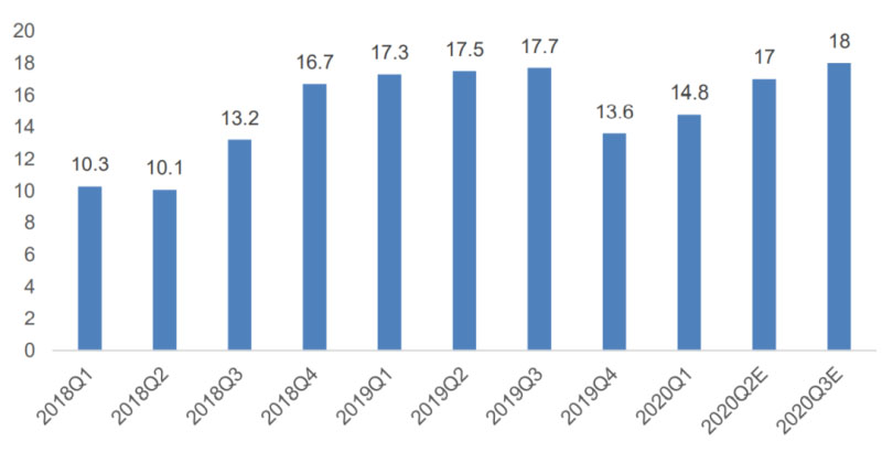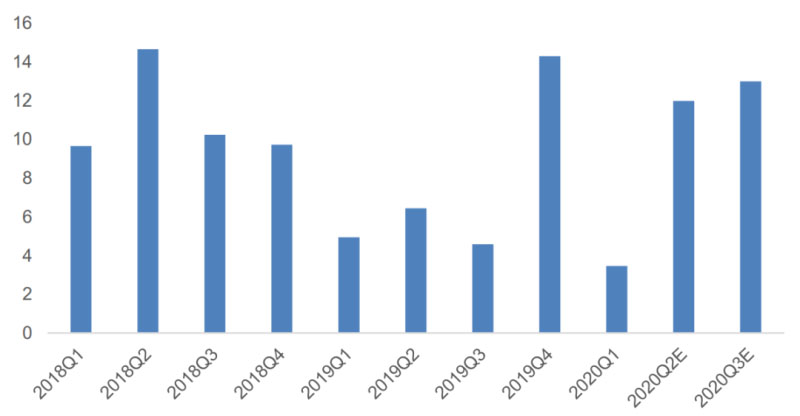 從歷史出口數(shù)據(jù)來看,2018年和2019年第三季度的組件出口環(huán)比均出現(xiàn)了改善, 其中2018年第三季度組件出口13.2GW,環(huán)比增長30%;2019年第三季度組件出口17.7GW,環(huán)比略有改善。隨著疫情的緩解,2020年4月份和5月份,組件出口分別為5.5GW和6GW,預(yù)計2020年第二季度出口數(shù)據(jù)環(huán)比改善明顯,而借鑒歷史數(shù)據(jù), 三季度組件出口有望環(huán)比繼續(xù)改善。