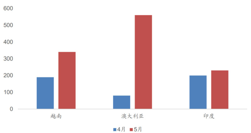 從組件出口數(shù)據(jù)來看,5月份出口到越南的組件規(guī)模為340MW,環(huán)比4月份的190MW提升明顯;5月份出口到澳大利亞的組件規(guī)模為560MW,環(huán)比4月份的80MW 提升明顯,5月份出口到印度的組件規(guī)模為230MW,環(huán)比4月份的200MW也略有提 升。隨著疫情的緩解,海外部分國家的光伏需求邊際改善,帶動出貨量的增長。