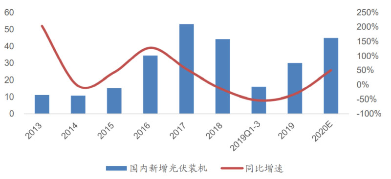 另外,近期產(chǎn)業(yè)鏈價格的下行,也會對國內(nèi)新增裝機(jī)有明顯的促進(jìn)作用。從歷史上來看,新增裝機(jī)和產(chǎn)業(yè)鏈價格呈現(xiàn)明顯的負(fù)相關(guān)關(guān)系。在報告《國內(nèi)光伏市場將對需求形成明顯拉動》中,我們預(yù)計2020年國內(nèi)新增光伏裝機(jī)有望達(dá)到甚至超過 45GW,同比增長約50%。