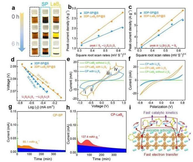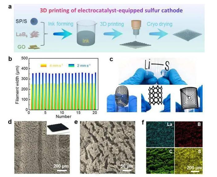 研究人員利用3D打印技術(shù),方便、高效、便捷地構(gòu)筑了高負(fù)載硫正極,該架構(gòu)具有經(jīng)過(guò)優(yōu)化的離子/電子傳輸通道和充足的孔隙率,有利于對(duì)多硫化物進(jìn)行高效管理。同時(shí),為了更好地抑制“穿梭效應(yīng)”,研究人員設(shè)計(jì)了包含硫/碳和LaB6電催化劑的混合墨汁,用于打印高性能的硫正極。金屬性LaB6電催化劑可以均勻地分布在3D打印的架構(gòu)內(nèi),自發(fā)地確保有豐富的活性位點(diǎn)用于多硫化物的固定和轉(zhuǎn)化,從而實(shí)現(xiàn)高效率的放電或充電過(guò)程。