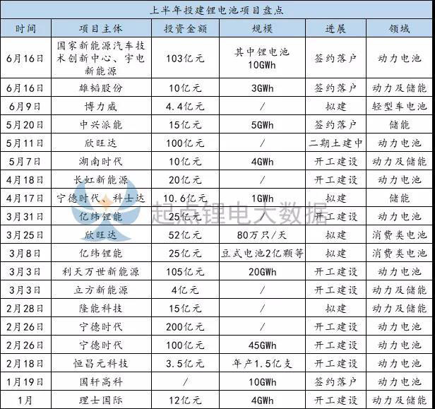 據(jù)起點(diǎn)鋰電大數(shù)據(jù)不完全統(tǒng)計,今年上半年超過20個鋰電池項目落地或投產(chǎn),涉及投資金額超過810億元,包括動力電池、消費(fèi)類電池、儲能電池等,具體如下: