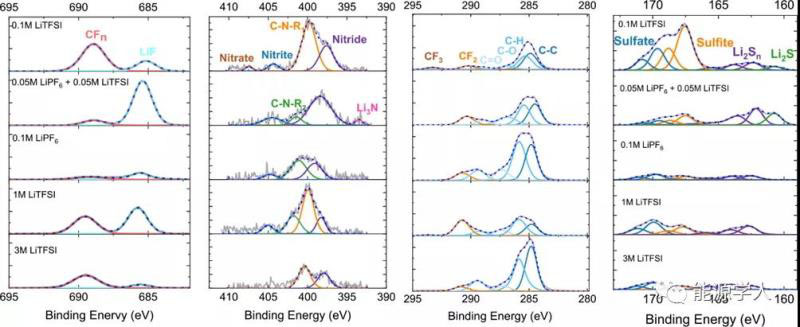 對(duì)測(cè)試后正極(圖8)的XPS分析表明,在所有電解質(zhì)成分的情況下,LiTFSI鹽和電解質(zhì)溶劑的分解與CEI的形成略有不同。對(duì)于低濃度電解質(zhì),CEI種類(lèi)主要包括:CFn、LiF、含N化合物、亞硫酸鹽,和硫酸鹽(圖9)??偟膩?lái)說(shuō),電解液中即使有1/10–1/3的鹽濃度,顯然也足以再現(xiàn)在1M和3M電解液組成中形成的保護(hù)性CEI的組成。含有0.05–0.1M LiF6的電解質(zhì)顯示出較低的CF2強(qiáng)度,而大多數(shù)LiTFSI電解質(zhì)具有較高的LiF與CFn。有趣的是,只有由0.05M LiPF6和0.05M LiTFSi組成的電解液中含有最明顯的Li3N,這是一種對(duì)電極保護(hù)非常重要的化合物。
