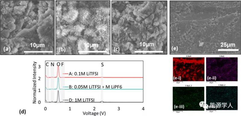 圖7(a)0.1M LiTFSI,(b)0.05M LiTFSI+0.05M LiPF6,(C)1M LiTFSI電池,(d)Li箔的EDS圖,(e)在0.05M LiTFSI+0.05M LiPF6中測(cè)試后的Li箔的EDS圖。