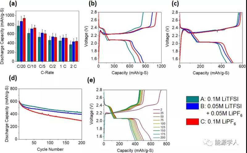 該研究工作將兩種常見(jiàn)的電解質(zhì)鹽LiTFSI和LiPF6,在低濃度下進(jìn)行組合,結(jié)果表明它們的組合產(chǎn)生的容量與傳統(tǒng)的1M LiTFSI電解質(zhì)相當(dāng)。與最初的預(yù)期相反,將電解液濃度從1M降低到0.2M并沒(méi)有增加鋰負(fù)極上的多硫化物溶解和Li2S沉積。事實(shí)上,倍率和長(zhǎng)循環(huán)測(cè)試都顯示低濃度電解質(zhì)的性能與標(biāo)準(zhǔn)1M電解質(zhì)相似或更好。其次,低濃度電解質(zhì)能夠?qū)崿F(xiàn)更低的成本和更高的能量密度,因此,對(duì)其可進(jìn)一步深入研究。