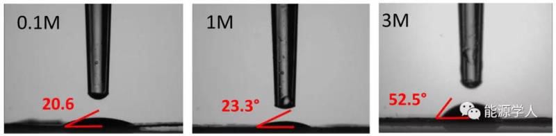 接觸角測(cè)量(圖2)顯示了0.1MLiTFSI、1M LiTFSI和3M LiTFSI樣品(A、D和E)的結(jié)果。剩下的電解質(zhì)(樣品B和C)太易揮發(fā),不能形成一滴。1MLiTFSI接觸角僅略高于0.1M LiTFSI,3MLiTFSI則是兩者接觸角的兩倍以上。樣品A、D和E分別用1.5、3和10秒浸潤(rùn)在電極中,與粘度數(shù)據(jù)相匹配。
