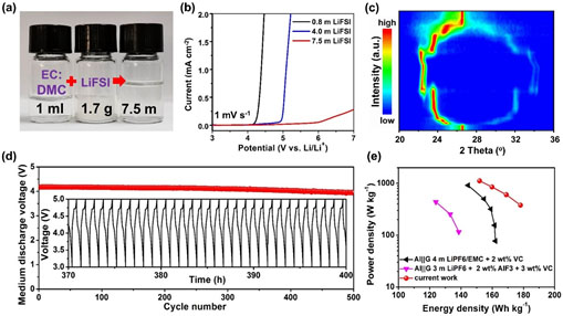 圖(a)溶劑與電解質(zhì)鹽共溶后獲得高濃度電解液的圖片;(b)不同濃度電解液的抗氧化LSV曲線比較;(c)高濃度電解液體系中,陰離子插層石墨正極的原位XRD表征;(d)雙離子電池長循環(huán)過程的放電中壓(插圖為長循環(huán)過程中的充放電曲線);(e)已報道雙離子電池能量密度比較。