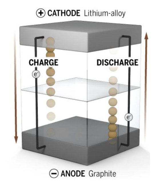 鋰電池的工作機(jī)制跟普通AA或AAA化學(xué)電池類似。它們有陽極端子和陰極端子,以及在兩者之間的電解質(zhì)。跟普通電池不同的是,鋰離子電池中的放電反應(yīng)是可逆的,所以電池可以反復(fù)充電。