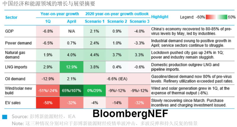 疫情爆發(fā)后,中國能源市場的需求在2月降至冰點,目前似乎出現(xiàn)恢復(fù)態(tài)勢。除新能源汽車銷量外,彭博新能源財經(jīng)追蹤的其他主要指標(biāo)4月均出現(xiàn)同比正增長。今年下半年市場前景仍取決于國內(nèi)刺激政策和第二波疫情防控措施的有效性,以及中國出口市場的恢復(fù)程度。