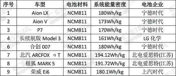 各車型配套NCM811電池系統(tǒng)能量密度