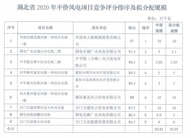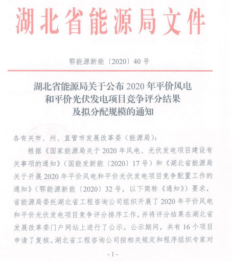 湖北省能源局關(guān)于公布2020年平價(jià)風(fēng)電和平價(jià)光伏發(fā)電項(xiàng)目競(jìng)爭(zhēng)評(píng)分結(jié)果及擬分配規(guī)模的通知