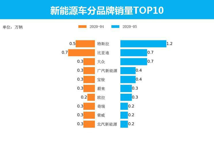 從品牌角度來看,5月新能源車銷量最高的五個(gè)品牌分別為特斯拉、比亞迪、大眾、廣汽新能源、寶駿,其銷量分別為1.2萬輛、0.7萬輛、0.7萬輛、0.4萬輛、0.4萬輛,占新能源車當(dāng)月銷售總量的55.0%。整體來看,前十品牌依然以傳統(tǒng)車企為主,但特斯拉等造車新勢(shì)力的強(qiáng)勢(shì)出擊,吸引了一部分消費(fèi)者的關(guān)注,對(duì)傳統(tǒng)新能源生產(chǎn)廠商產(chǎn)生了一定的沖擊。