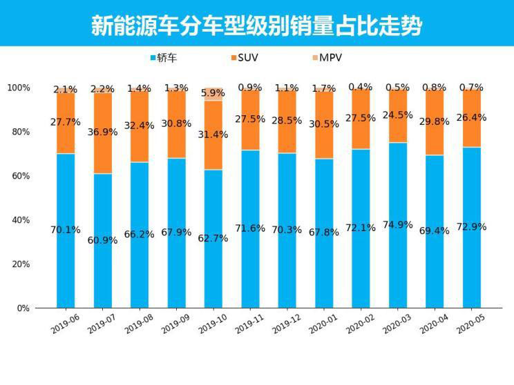 從整體新能源市場(chǎng)銷量情況來看,2020年5月,新能源車共銷售了6.0萬輛,占整個(gè)市場(chǎng)銷量的3.8%。與上個(gè)月相比,新能源車銷量環(huán)比增長(zhǎng)24.7%;與去年同期相比,新能源車銷量同比下跌29.1%,不過去年6月銷量猛增,是受到了新能源補(bǔ)貼調(diào)整影響。