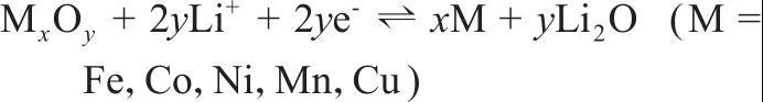 在該反應(yīng)中,金屬氧化物與其金屬態(tài)之間不斷地發(fā)生可逆的轉(zhuǎn)化反應(yīng),從而實(shí)現(xiàn)鋰離子的嵌入/脫出過程。在近些年的報(bào)道中Fe3O4、CoO、均是較為常見的依賴于轉(zhuǎn)化反應(yīng)的負(fù)極材料,它們具有較高的容量(500~1500 mA·h/g)和更低的電位平臺(tái)(< 1 V,vs. Li/Li+),然而它們的缺點(diǎn)主要為導(dǎo)電性差、循環(huán)過程中體積膨脹以及初始不可逆容量大等,所以通過引入石墨烯構(gòu)建堅(jiān)固的支架和導(dǎo)電網(wǎng)絡(luò)是改善該類材料循環(huán)壽命和倍率性能的有效途徑。